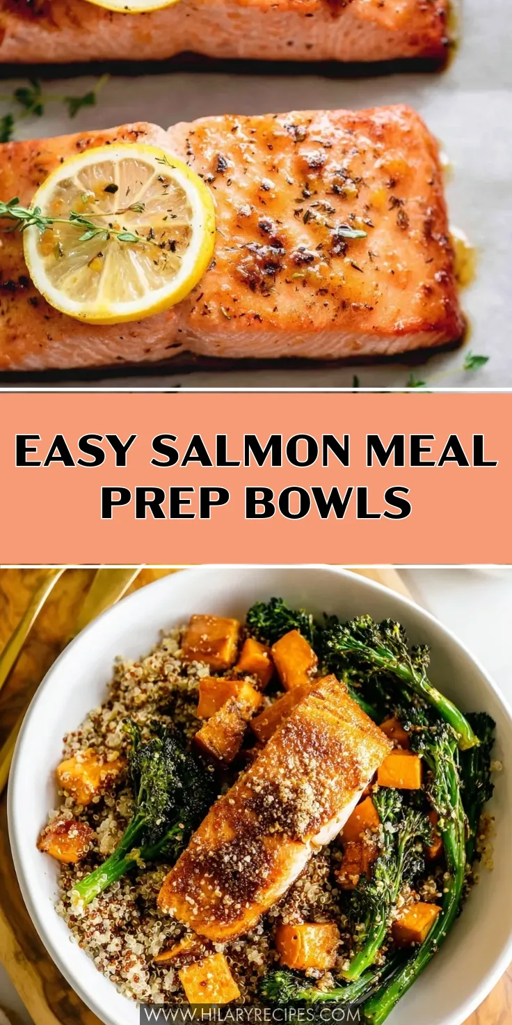 A vertical split-screen meal prep graphic featuring a close-up of a glazed baked salmon filet with a lemon slice and thyme on top, and a white bowl filled with tri-colored quinoa, roasted sweet potatoes, charred broccolini, and a salmon filet.