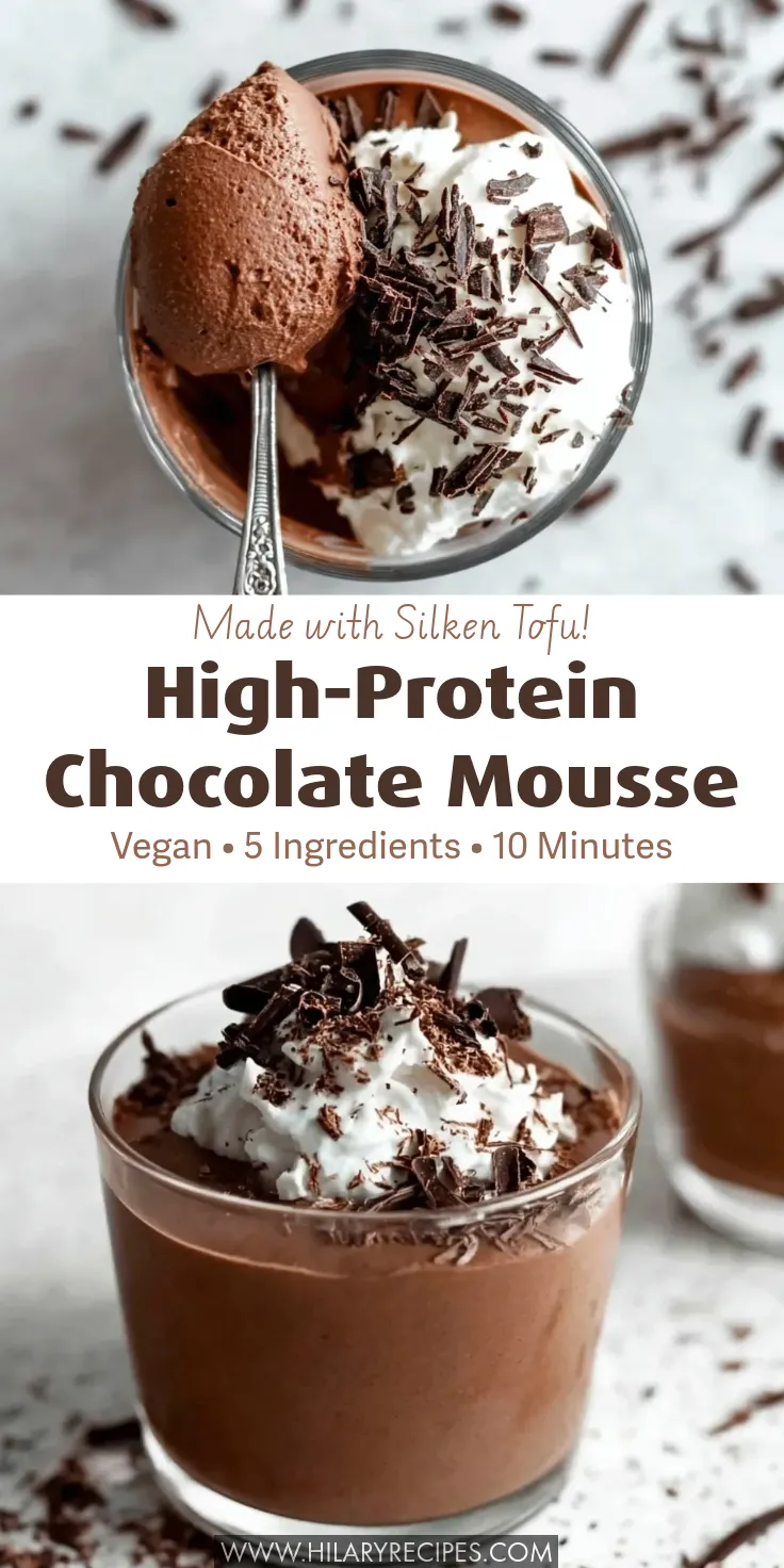Pinterest graphic featuring a split screen of high-protein vegan chocolate mousse made with silken tofu. The top image shows a spoonful being scooped to reveal a thick, creamy texture, while the bottom image shows the dessert in a glass topped with dairy-free whipped cream and dark chocolate shavings. Text overlay reads: "Made with Silken Tofu! High-Protein Chocolate Mousse. Vegan • 5 Ingredients • 10 Minutes."