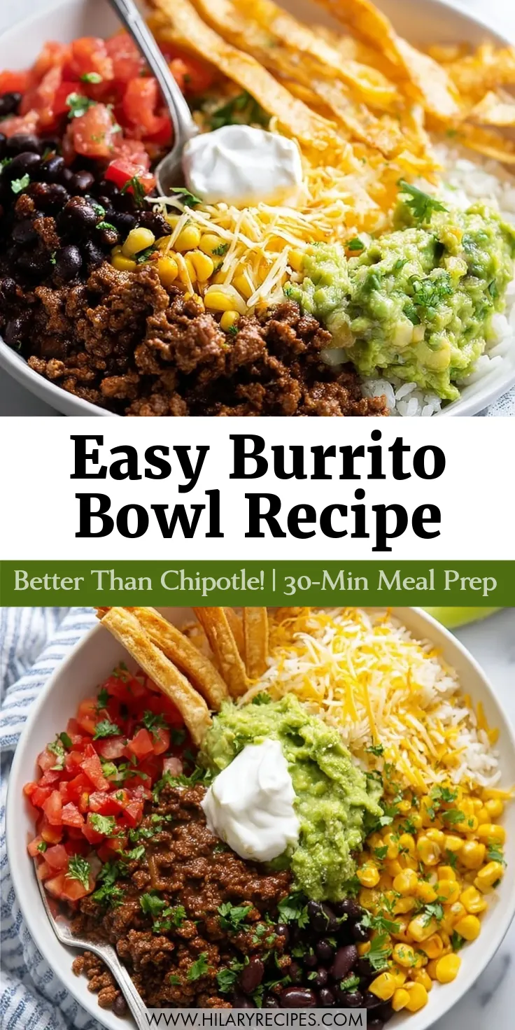 A Pinterest-style graphic featuring two views of an easy bean and rice burrito bowl loaded with seasoned beef, black beans, corn, guacamole, and crispy tortilla strips. Text overlay reads: "Easy Burrito Bowl Recipe: Better Than Chipotle! 30-Min Meal Prep."