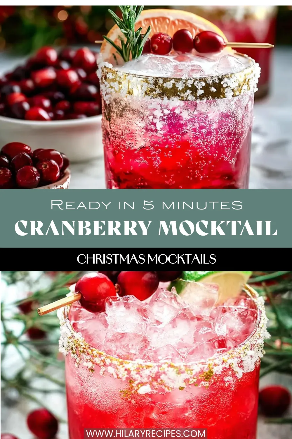 A festive red cranberry mocktail in a glass with a sugared rim, garnished with fresh cranberries and a rosemary sprig. Text overlay reads: "Ready in 5 Minutes Cranberry Mocktail."