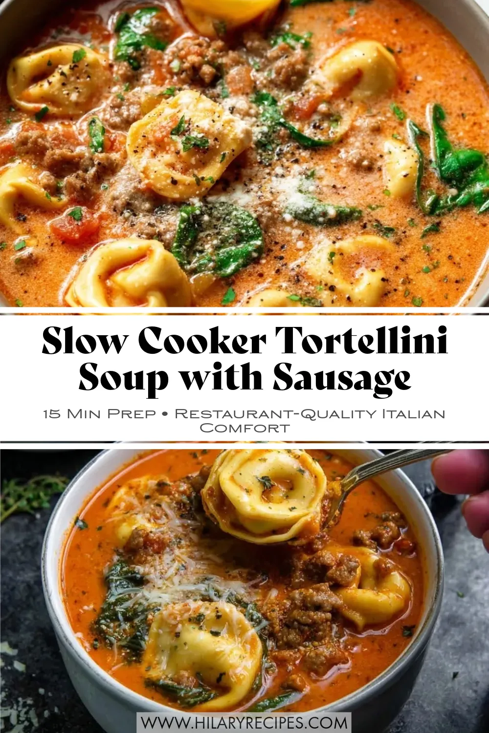 A Pinterest pin collage featuring a close-up of creamy Slow Cooker Tortellini Soup with Sausage, text overlay reading "15 Min Prep - Restaurant-Quality Italian Comfort," and a bottom photo of a spoonful of tortellini being lifted from a bowl.